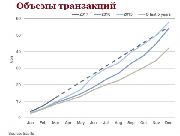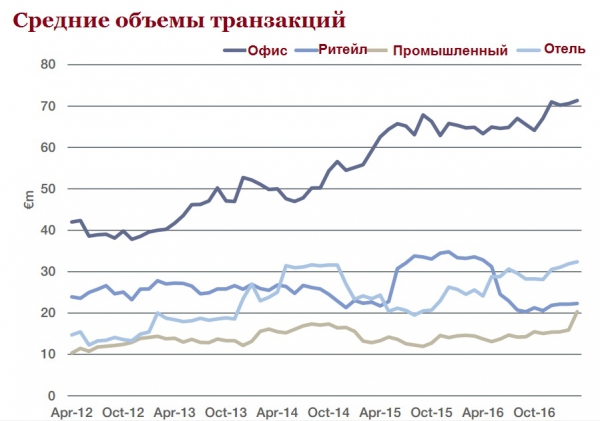 Наиболее значительный рост спроса в первом квартале 2017 года наметился по отношению к промышленной недвижимости . Квартальный объем транзакций составил €1,898 млрд., показав 83% рост по сравнению с аналогичными показателями прошлого года. 22% ростом характеризуется офисный сектор недвижимости, с квартальным объемом транзакций €4,64 млрд. Ритейл оказался сферой с более умеренным ростом динамики (+8%), достигнув квартального показателя €2,77 млрд. Некоторым снижением характеризуется гостиничный сектор (-4%, объем транзакций €597 млн.). Наименьшим спросом отличилась покупка земельных участков с падением спроса на 46% по сравнению с показателями за первый квартал 2016 года и объемом транзакций в €167 млн.